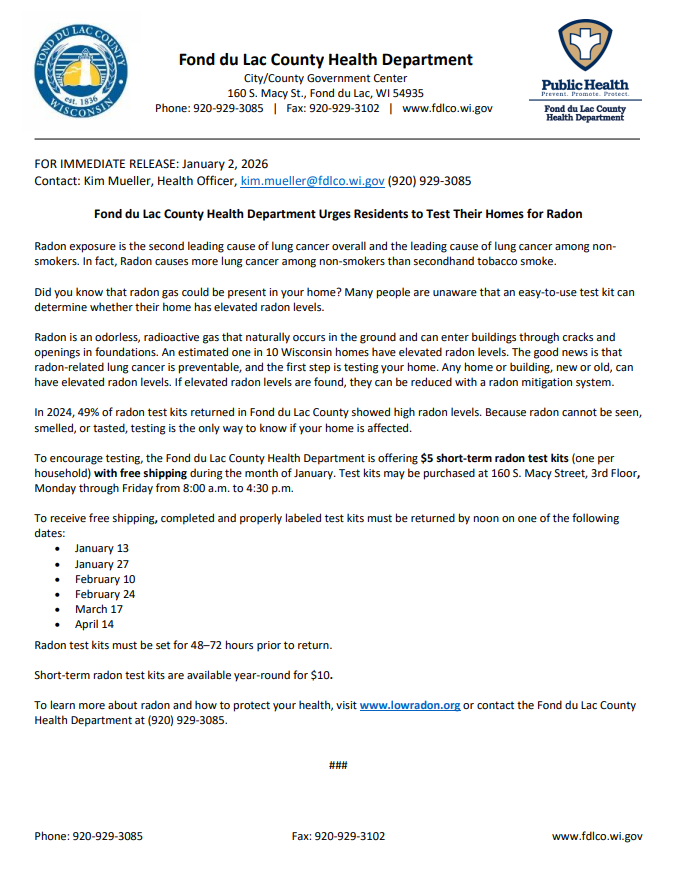 FDL County Health Department – Radon Testing January 2, 2026 in Uncategorized Click here for PDF format: Radon Testing Information